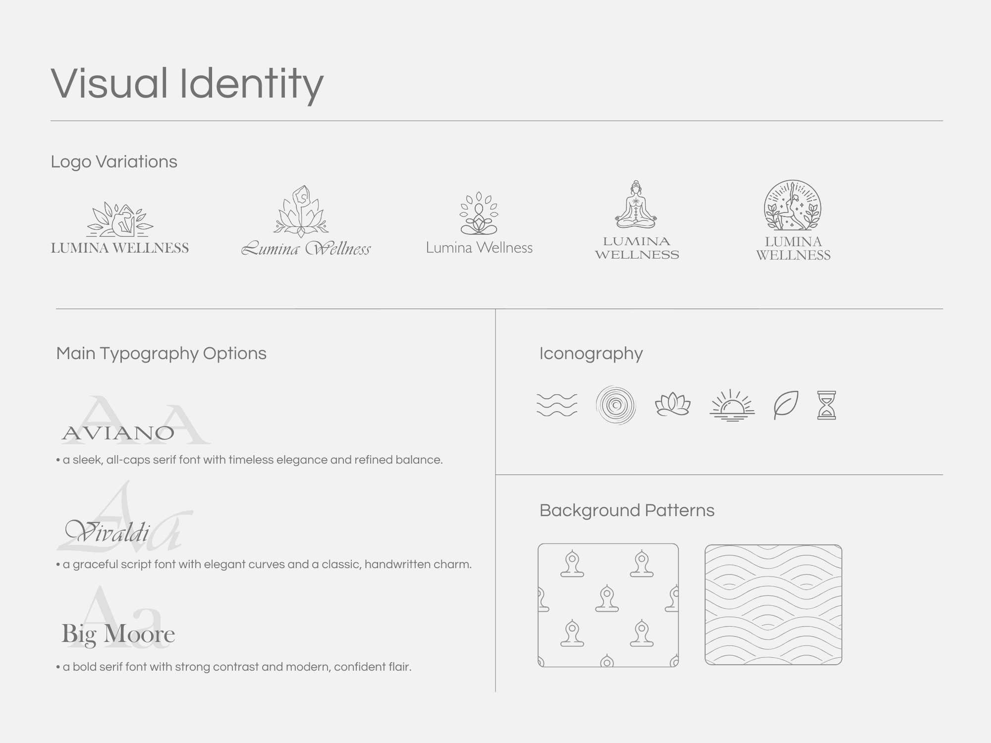 The Visual Stretch I mapped the customer journey and rolled out a full visual identity — logo, colors, typography, icons — plus merch mockups, brand guidelines, and a responsive website. Each element reflects Lumina Wellness’ calm, confident personality, flowing seamlessly across digital and physical experiences. The result? A cohesive, playful brand that moves as smoothly as a yoga flow.