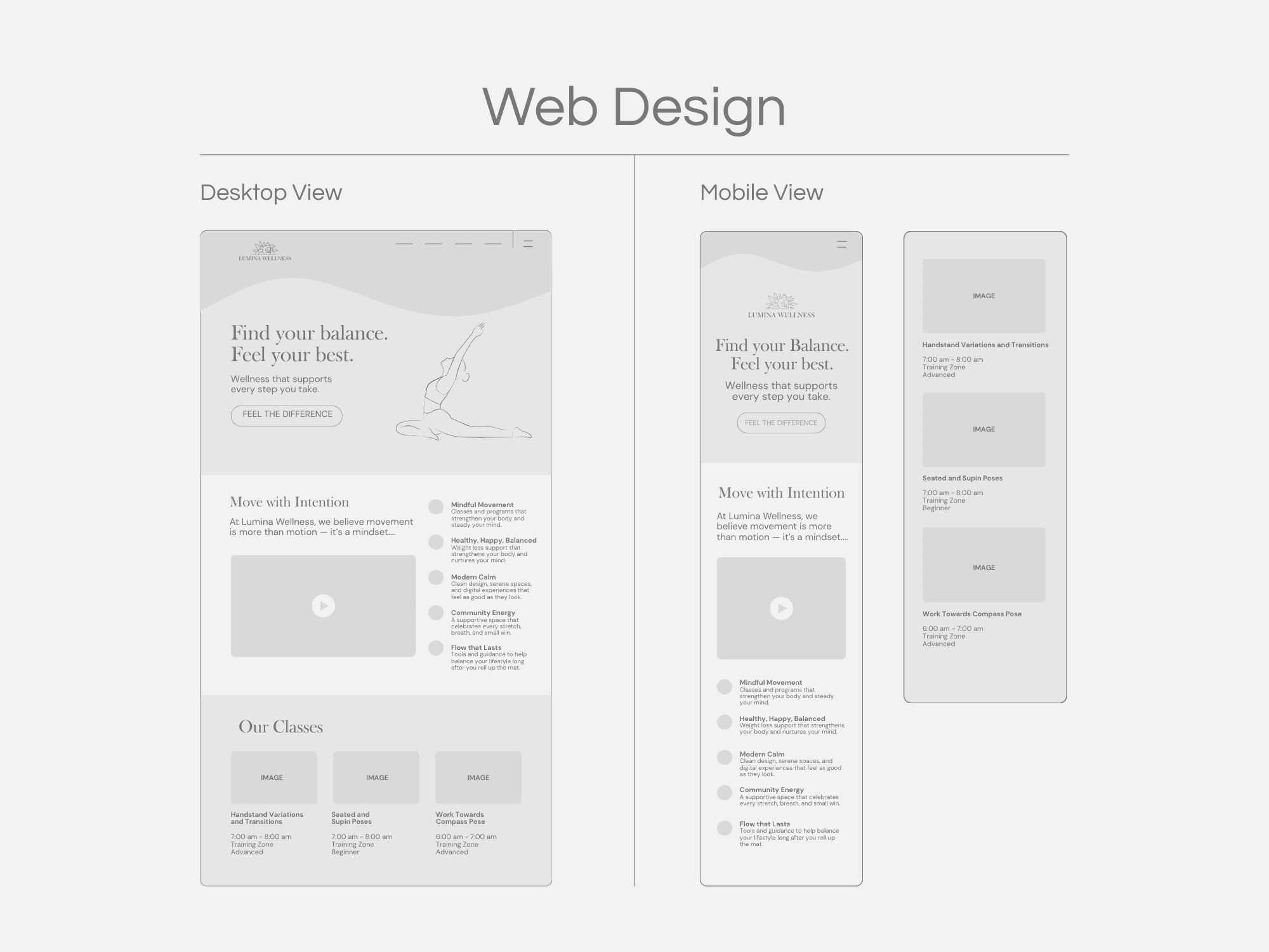 Calm, But Chaotic Lumina Wellness had a strong mission, but its visual identity was all over the mat. Logos, marketing materials, and website elements weren’t aligned, leaving the brand feeling scattered and hard to recognize. The challenge was to create a cohesive visual identity and website that would flow smoothly across digital and physical platforms, inspire trust, and leave a lasting impression — a brand that flexes without strain.